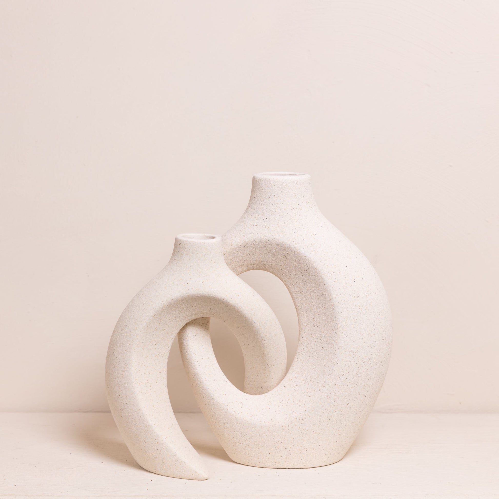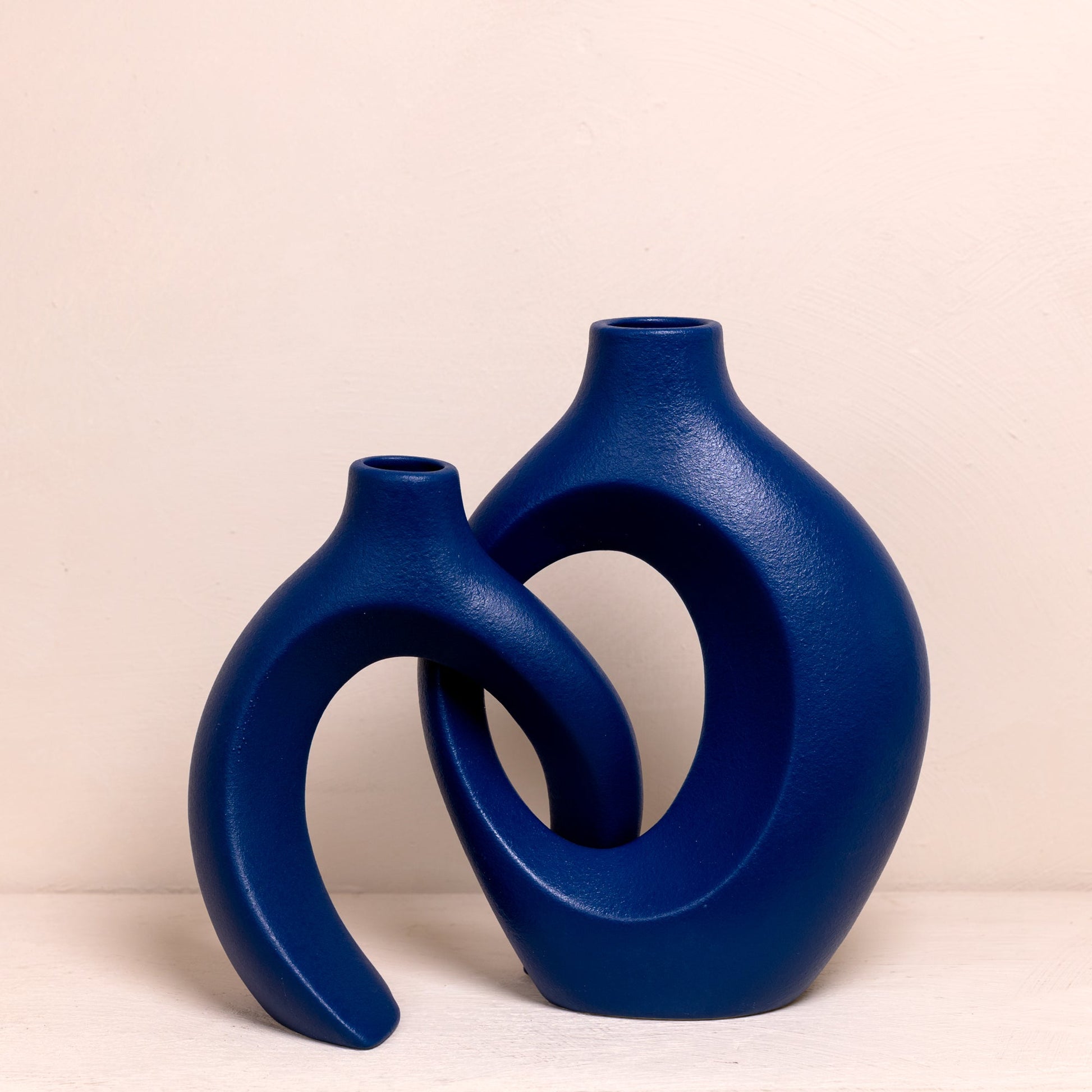 Embrace Scandinavian simplicity with this set of two handwoven vases. Crafted from 100% natural ceramic materials, their intricate basket-weave design adds texture and warmth to any space. Ideal for dried flowers or as standalone pieces, these vases bring a touch of nature indoors. Available in matte black, cream white, and indigo blue finishes.